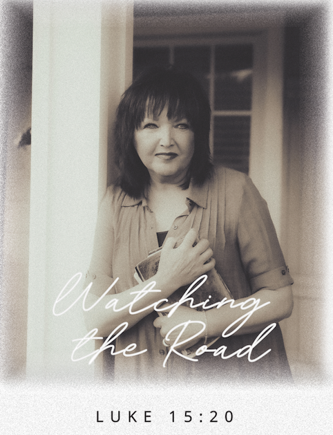 This long sleeve shirt has a picture of Karen on her front porch Watching the Road.