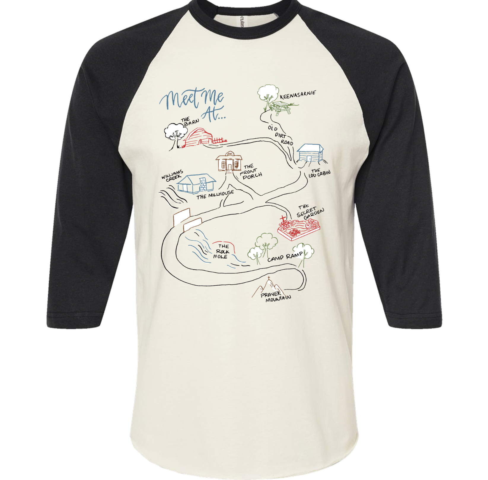 This special-edition baseball tee features a hand-drawn map of some of the most beloved landmarks from Karen's property — the sacred spaces where the Front Porch Friends gather in spirit every Wednesday. Whether it's Prayer Mountain, the Secret Garden, or The Front Porch, each location holds a memory, a moment, a miracle.